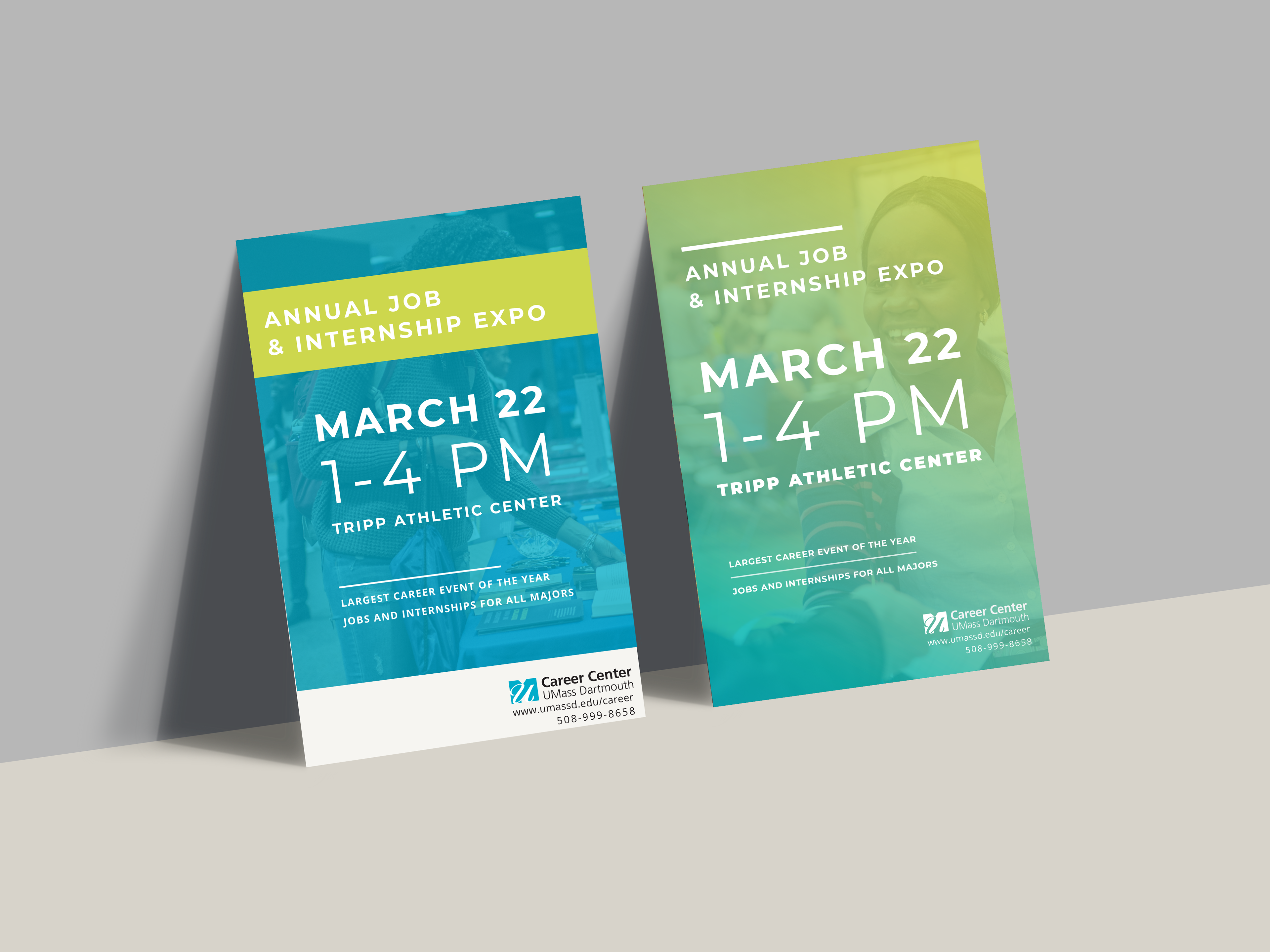 The Career Center at UMASS Dartmouth was looking for cohesive poster and TV slide templates to promote Career Center events. Using university approved colors, type, and images, I utilized transparencies over images to make type visible in any combination of color and image.
